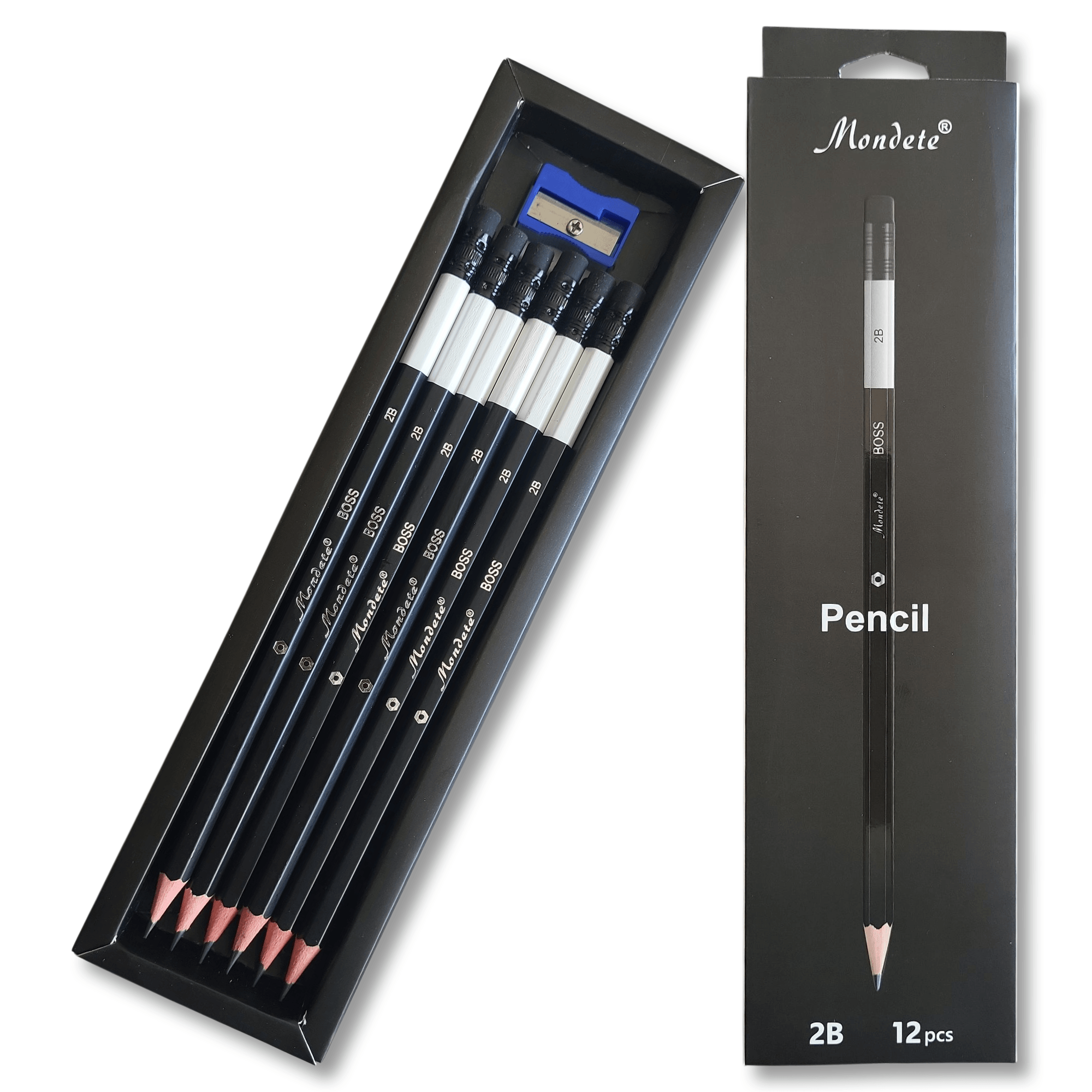 Coffret de 12 crayons à papier Mondete BOSS 2B noirs, gomme intégrée et taille-crayon inclus. Idéal pour le bureau, l’école et le dessin.