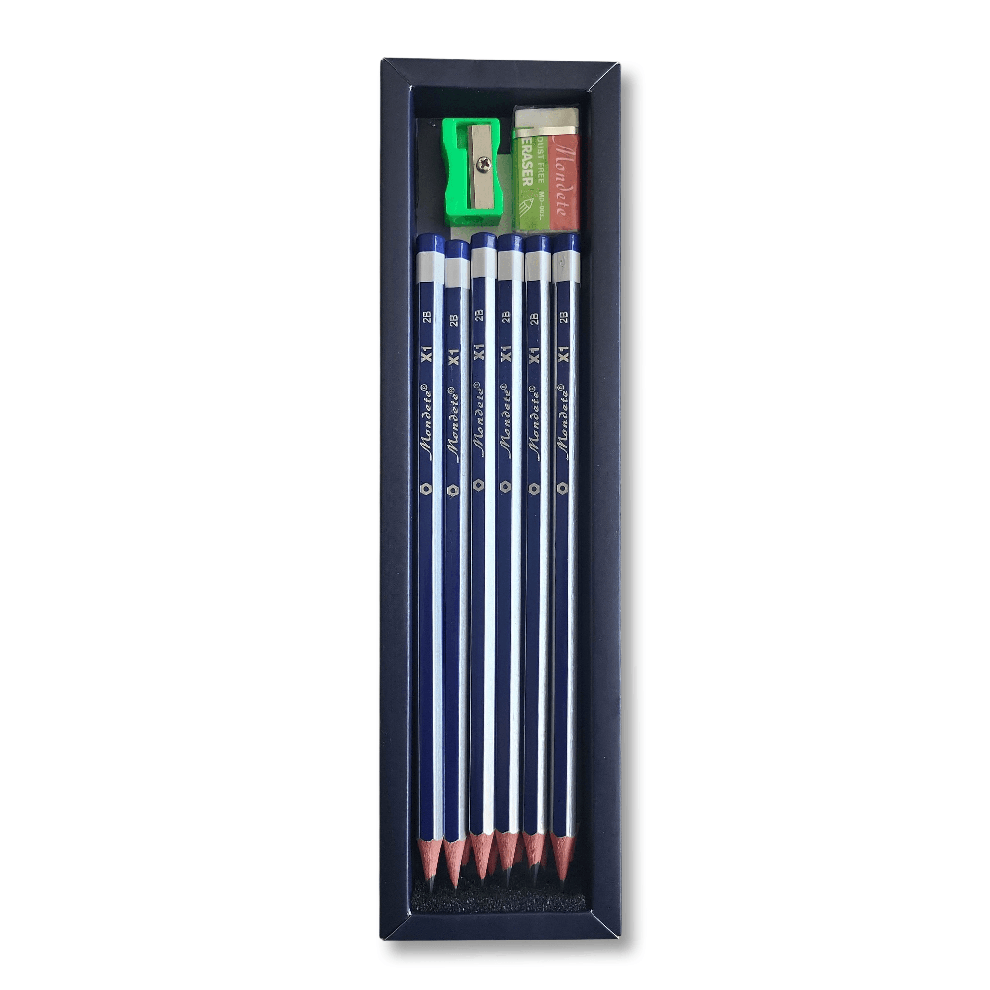 Étiquettes : 2B, bleu, bureau, coffret, Crayon, créativité, design, dessin, école, fournitures scolaires, Gomme, Mondete, organisation, papeterie, qualité, taille-crayon, X1