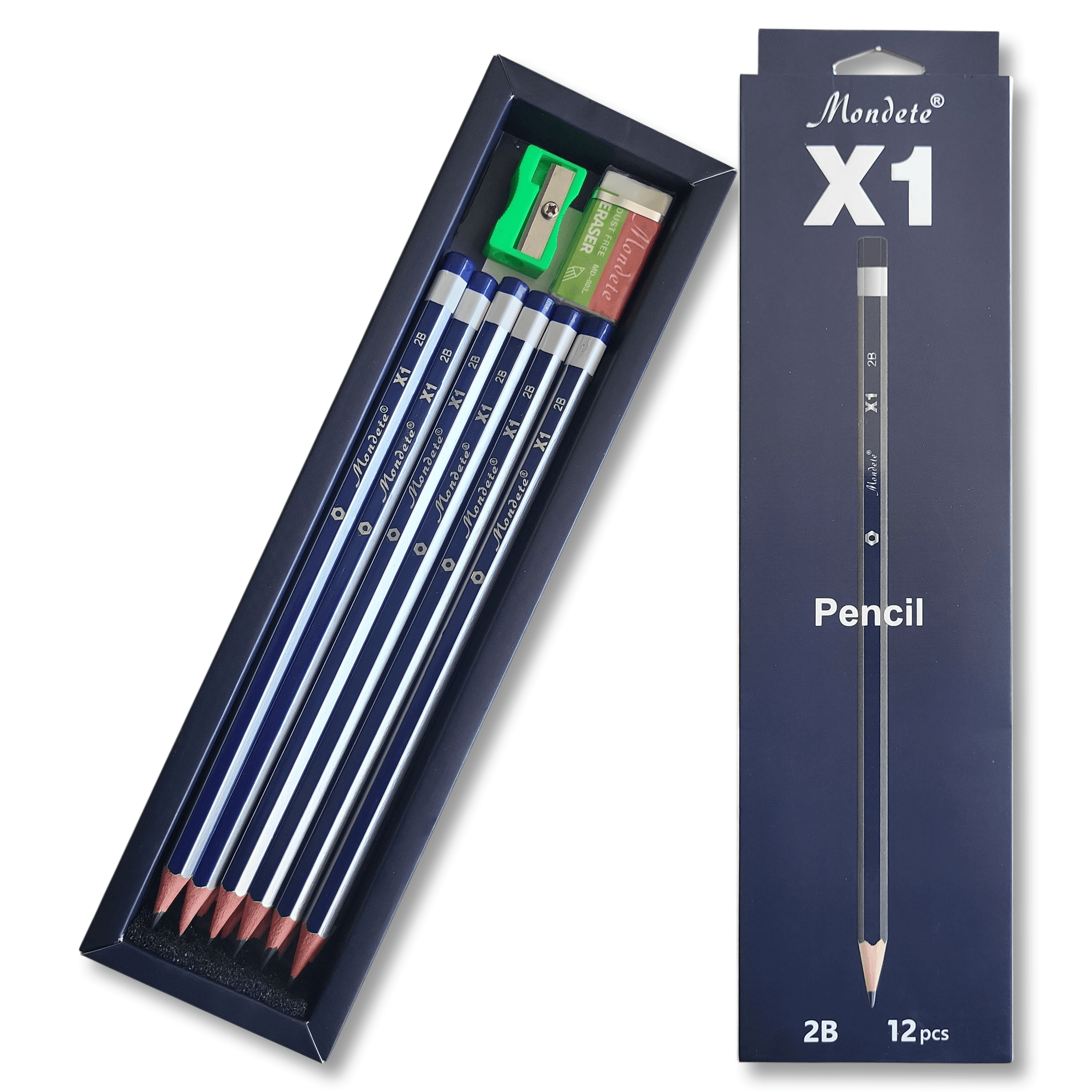 Crayons à papier Mondete X1 2B – Étui de 12 pièces avec gomme et taille-crayon
