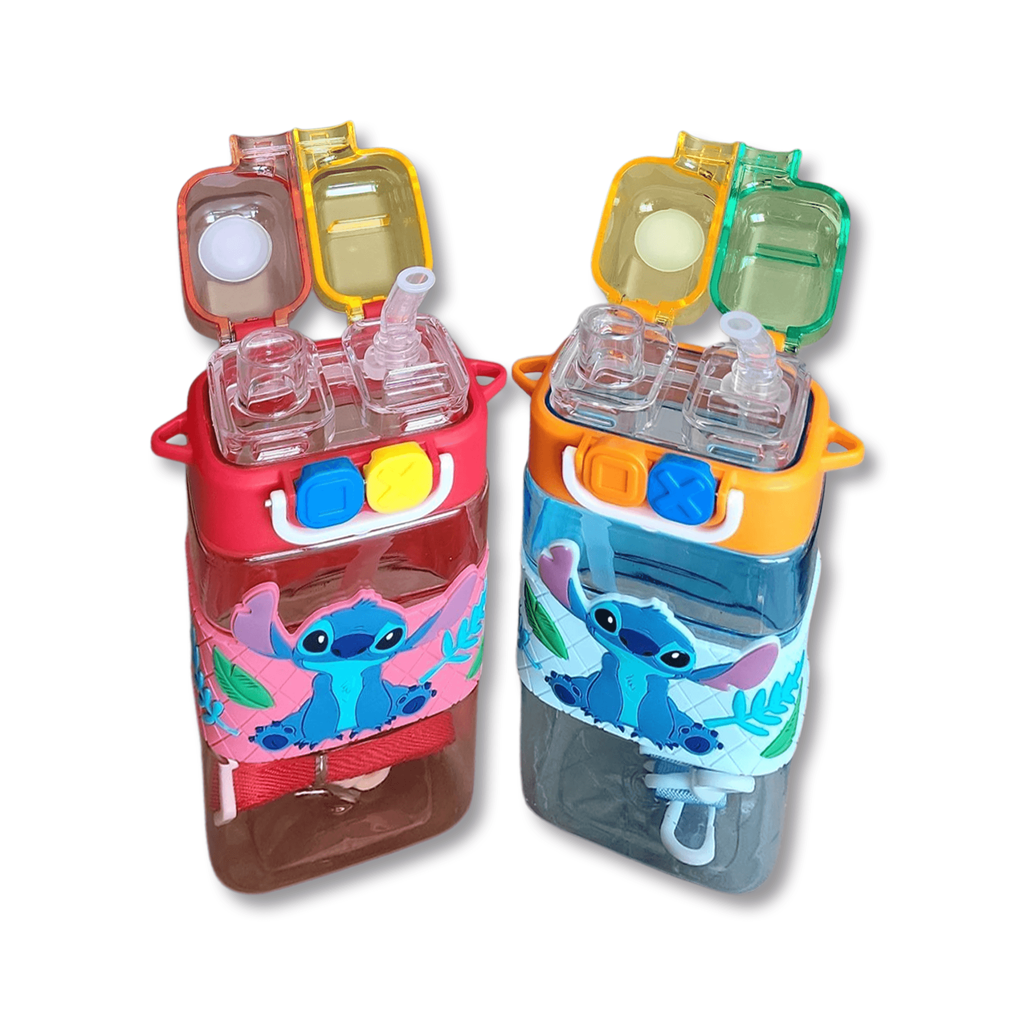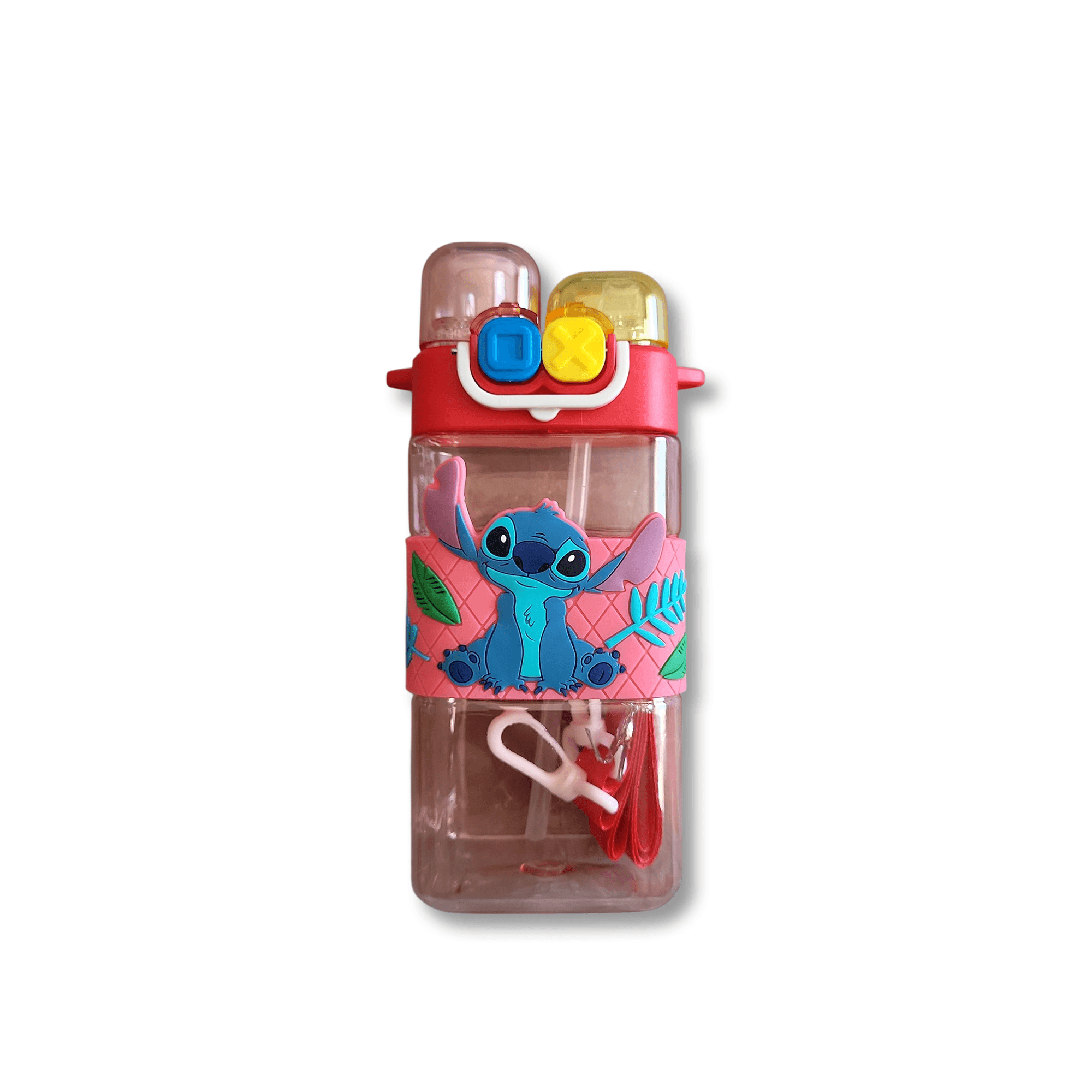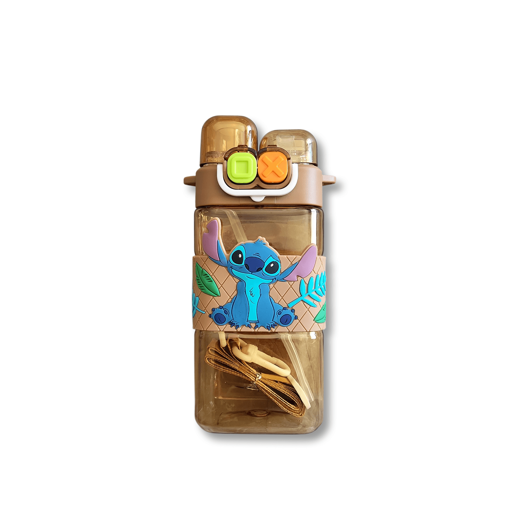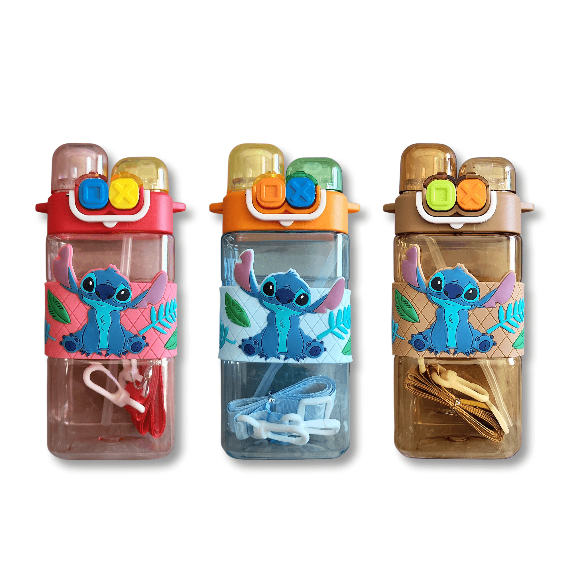 Bouteille d’eau pratique et ludique avec le personnage de Stitch, fabriquée en plastique de qualité sans BPA, avec un bouchon hermétique et une sangle pratique. Disponible en trois couleurs : rouge, orange et marron.