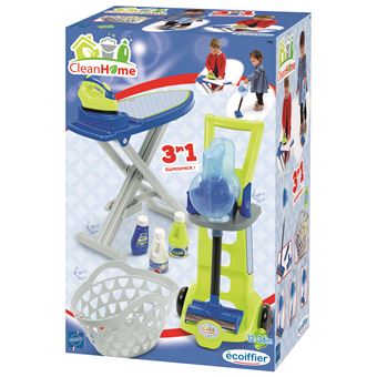 3 jouets en un seul produit : un chariot avec un aspirateur balai et ses deux suceurs, une planche à repasser et son fer à repasser, et enfin une corbeille à linge remplie de flacons factices de produits ménagers. Conseillé dès 18 mois. Origine France Garantie.