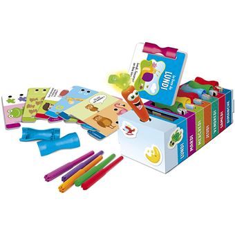 Contenu: 1 carotte parlante et lumineuse – 48 pages en carton pour créer les livres – 7 clips pour relier les livres – 1 kit en carton pour construire le coffret – 6 crayons gras – 2 planches d’autocollants – Manuel d’instructions