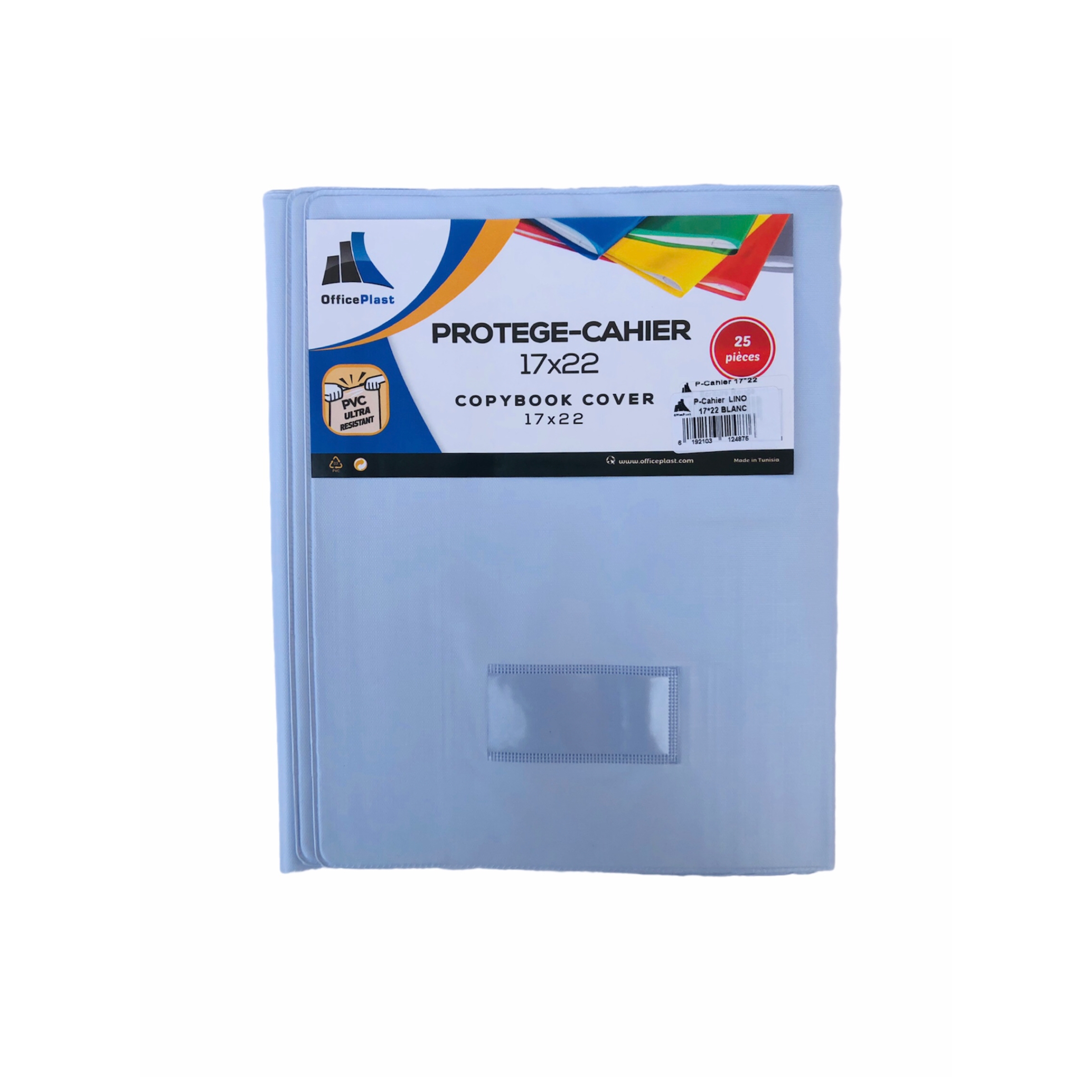 Protège-cahier lino blanc Office Plast 17×22, lot de 25 pièces, design à carreaux blancs, protection robuste en PVC.